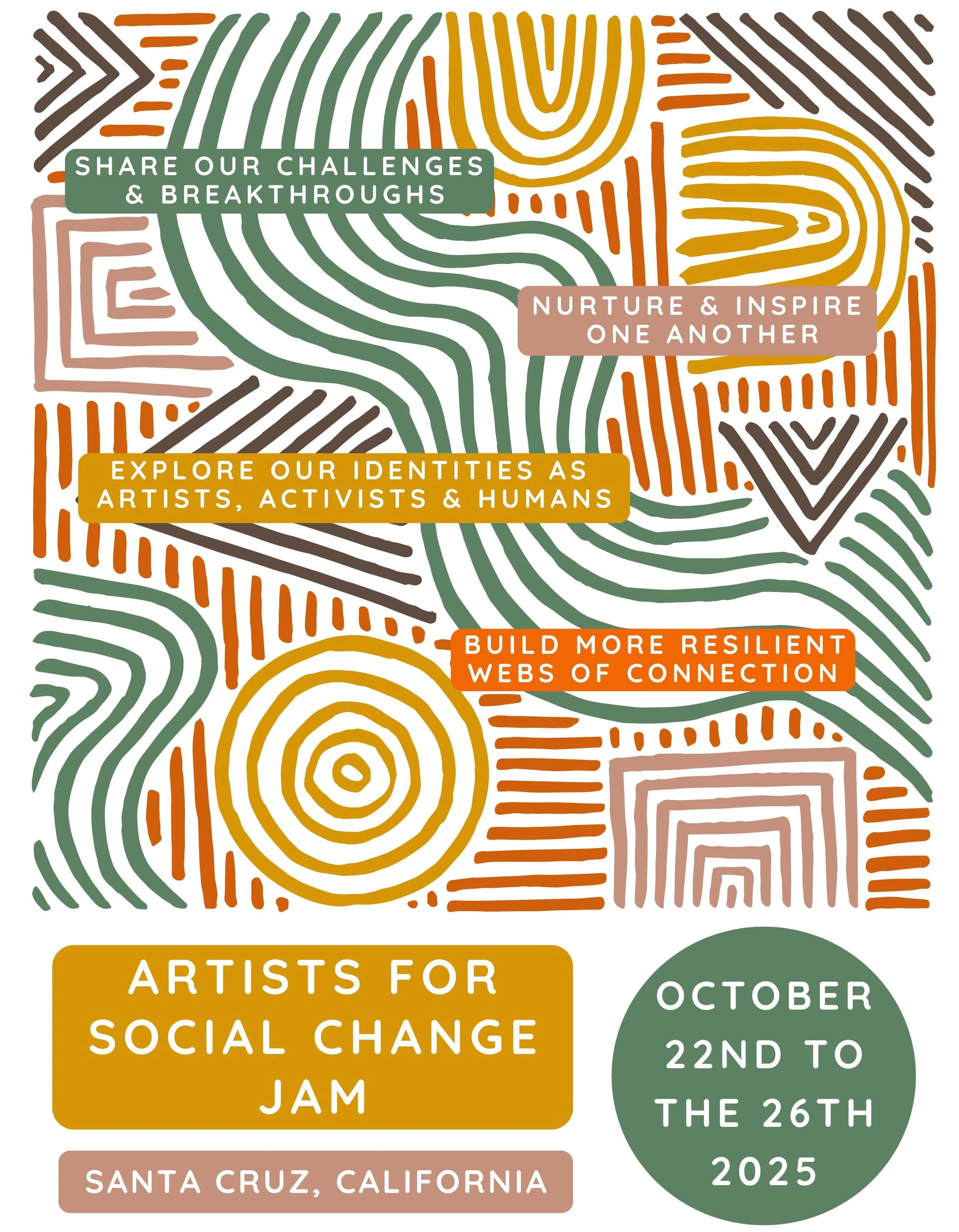That is the intention and the dream of the 2025 Arts for Social Change Jam. We are here as fellow artist-activists, committed to a vibrantly just future and enjoying our lives along the way – and we can’t do it without your particular brand of magic. Come and fill your cup.